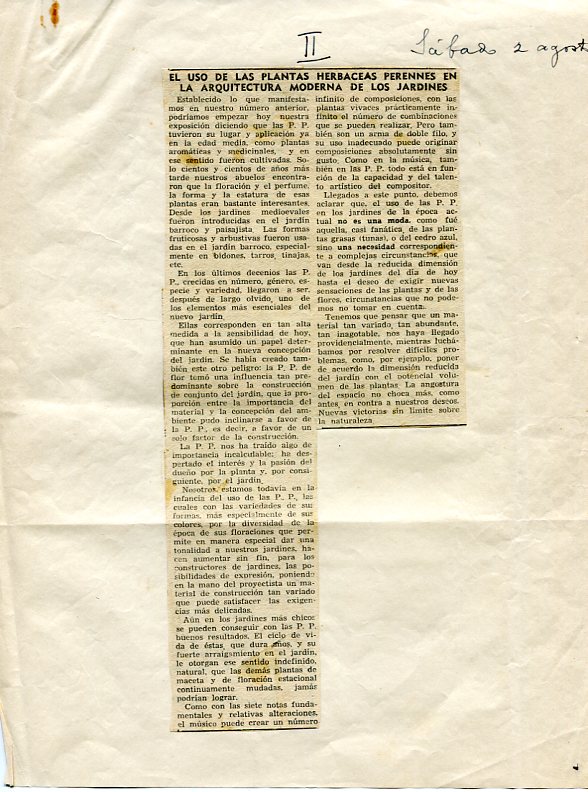 Llegados a este punto, debemos aclarar que el uso de las P.P. en los jardines de la época actual no es una moda, como fue aquella, casi fanática, de las plantas grasas (tunas), o del cedro azul, sino una necesidad correspondiente a complejas circunstancias, que no podemos no tomar en cuenta.