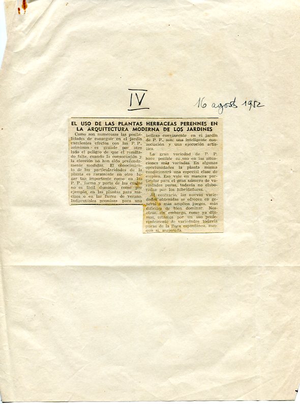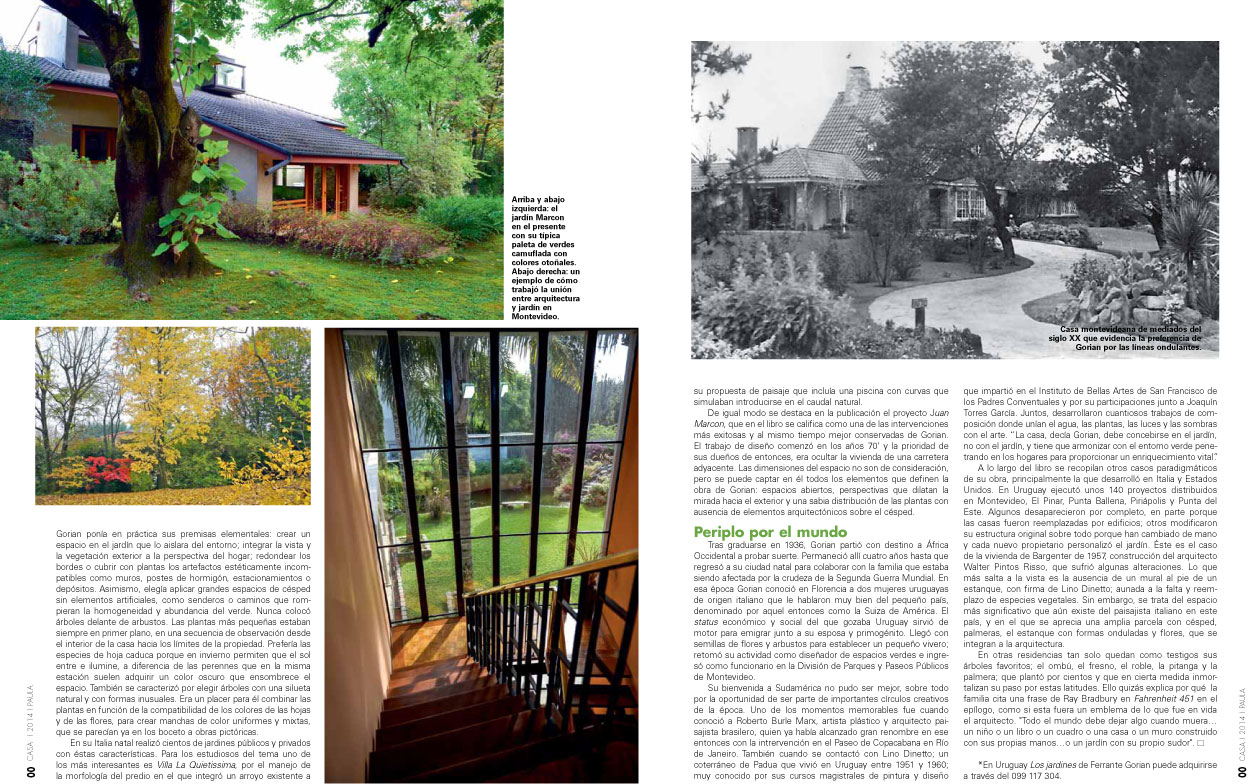 OTRO MANUSCRITO CLARIFICADOR. Cuando yo todavía iba en pantalones cortos (o casi) y asistía al Liceo Clásico en Gorizia, recuerdo que el papel con membrete en la tienda paterna rezaba: Raimundo Gorian hijo de Francisco, floricultor – Casa fundada en 1860. En marzo de 1930 mi padre Raimundo nos dejó para siempre y grave fue el trastorno que se produjo en el vivero, dejando todo el peso de la hacienda sobre los hombros de mi madre: años 30s, crisis global, poco trabajo, miseria, pero a pesar de todo había que seguir hacia adelante. Todos los familiares se afanaron encontrar una escuela en Italia que me pudiera dar una base científica para la continuación del “comercio” con seriedad y capacidad. Mi hermana mayor, que estudiaba Derecho en “Le Cascine” en Florencia informó de que había una escuela especializada en horticultura y jardinería que a lo mejor podía ser lo que yo necesitaba para continuar el negocio. ¿Pero y el dinero? Dentro había un internado para los no residentes en Florencia, pero aquella colegiatura era imposible para nuestras finanzas. El municipio de Gorizia, la Caja de Ahorros y el Instituto de Crédito Inmobiliario para las Venecias prometieron pagar tal renta siempre que obtuviera la máxima puntuación durante el trienio que duraba el curso entero. Parecía como en un cuento de hadas… pero así fue. Asistían a estos cursos, casi en su totalidad hijos o parientes cercanos de floricultores o viveristas. Menciono brevemente algunos nombres: Breviglieri de San Benedetto Po; Bianchi Cesarini de Como; los ligures Natta, Accame, Borrelli, Massa; Duilio Cosma de Trieste; Bonfiglioli de Bolonia; Ortelli, Marinelli, Fibbi, Spalletti, Baronti, etc., de la Toscana. Pietro Porcinai fue mi superior en la sección “Jardines” desde 1930 hasta1933. Siempre ha valorado, apreciado y ayudado cuando me encontré con problemas en las circunstancias tristes de la última guerra. Hace casi sesenta años, él y yo estábamos peleando la misma batalla. Frente a una literatura italiana paisajística prácticamente inexistente en los años 30, con una enseñanza superior igual a CERO, tuvimos que estudiar a fondo los idiomas inglés y alemán para explotar la abundante bibliografía Inglesa, americana, alemana y suizo-alemana. Recuerdo que al final de cada año escolar P. Porcinai montaba en su Triumph 350, al hombro la Rolleiflex, y se iba para el centro de Europa. Le pregunté por qué se iba siempre allí. “¿Y dónde quieres que vaya, si no?” Recuerda que los países anglosajones son los que nos enseñan, en la actualidad. “Ante mi objeción: “pero, cómo: nosotros los latinos, con nuestros jardines franceses o italianos… Él respondió: Olvídalo… nosotros fuimos geniales”, y suspiraba… En esa época era famoso en Europa trío Karl Foerster, Hermann Mattern y Gerda Gollwitzer de la Universidad politécnica de Berlín (1926), como no podía ser de otra manera. Hemos aprendido mucho también del padre de las autopistas alemanas Alwin Seifert cuando exigía que todas las estructuras en cemento armado, fueran recubiertas con piedra natural del lugar y/o plantas de la flora local. Y nosotros (1993), todavía estamos ahí, mirando las estrellas… Desde el otoño de 1933 al otoño de 1935 yo enseñaba en las escuelas de formación profesional agrícola. Mientras tanto había mejorado la situación económica de la empresa paterna y yo pude hacer algunos trabajos con mayor facilidad. A continuación, fui reclutado para el ejército. Después del paréntesis de la guerra volví a Florencia, y, como sucede entre viejos amigos, P.Porcinai había pensado en mi colaboración dentro de la empresa “The Garden”, en la Piazza del Carmine. Pero Italia se me quedaba pequeña. En un determinado momento, y a través de personas conocidas (1948), obtuve un contrato de trabajo como asesor en la Dirección Paseos de Públicos de Montevideo (Uruguay). En 1949 creé en ese país una empresa de construcción, la transformación y el mantenimiento de parques y jardines con vivero contiguo de plantas herbáceas perennes y arbustos de flora subtropical, y renuncié al cargo público. En este punto, necesito aclarar: yo que creía ser un tigre en la botánica, me encontré a mí mismo como un ignorante cualquiera. Por el contrario el Dr. Atilio Lombardo, reconocido autor de numerosos textos sobre la flora autóctona, me preguntaba los nombres científicos de las plantas comunes para nosotros en el norte de Italia, pero poco conocidas en Uruguay, como Cotinus Rhus o Ligustrum Sinense. Advertencia a los llamados expertos en nuestra casa: no saquen pecho creyendo que ya saben todo, pero ser pacientes, y pedalear con los ojos bien abiertos. En 1958, a través de un arquitecto de Montevideo, un amigo de Burle Marx, volé a Río de Janeiro y fui huésped en su finca (chacra) de San Antonio, con su famoso umbráculo de plantas tropicales, así como en su espléndido estudio de Ipanema. No he tenido problemas para conocer través de él, al arquitecto Lucio Costa (uno de los diseñadores de Brasilia), a Rino Levi y Serge Bernard. Todos eran piezas de artillería de 90, que incluso hoy no puedo evitar comparar la extrema democracia de América del Sur con la arrogancia de uno pocos italianos que ni siquiera te atienden al teléfono… En Montevideo, en la década 50-60 vivía cerca de mi casa en la zona residencial de Carrasco, el conocido pintor Lino Dinetto. Éste, discípulo de Bernard Berenson y Enzo Carli, cuando aún no había cumplido los veinte años, pintó el enorme lienzo con la “Última Cena” en el monasterio de Monte Oliveto Maggiore (Siena). Los dos juntos, hemos realizado desde entonces muchos encargos, que mi forma de pensar sobre la asociación y la combinación de plantas, en la luz y la oscuridad, el vacío y el lleno, la “pausa” en la composición de las masas verdes, en la estática y la dinámica de las plantas (árboles), desde entonces, repito, ha c